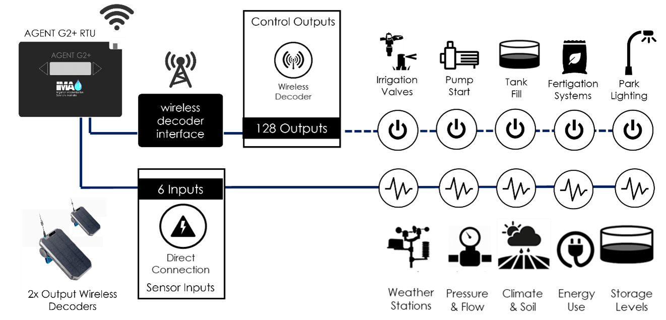 The IoT Gateway supports wireless decoder connections for control outputs in addition to or in conjuction with the direct connections available using the private wireless network with a stable range of around 3km.