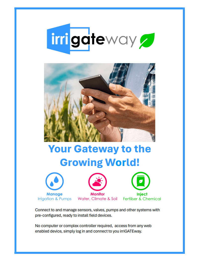 Our IoT Gateways are remote telemetry, monitoring and control devices that come pre-integrated to irrGATEway, able to read sensor interfaces and control connected devices.