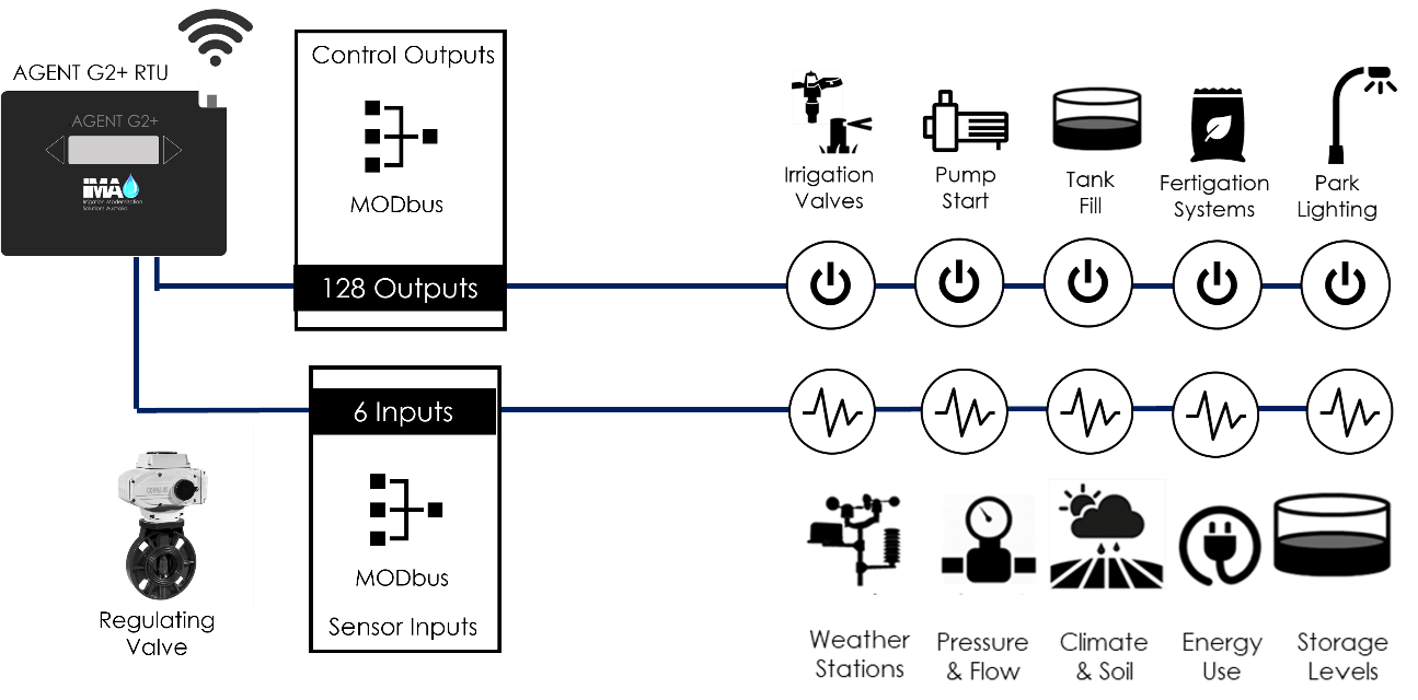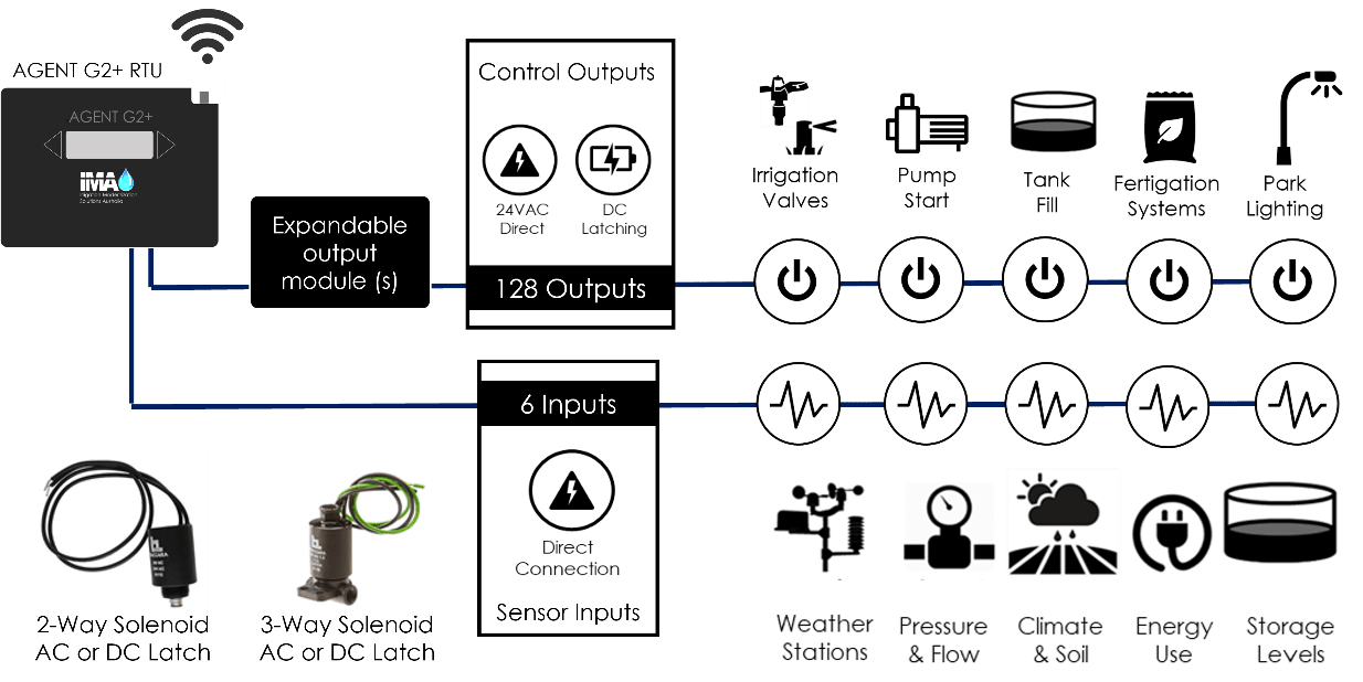 The IoT Gateway connects directly to most solenoid actuators that are found on popular brands of control valves, also with any commercially available relays that can accept AC or DC Latching inputs, and will connect to sensors with a range of input protocols including closed contact, 0-5v, 4-20mA, SDI-12 and MODbus.