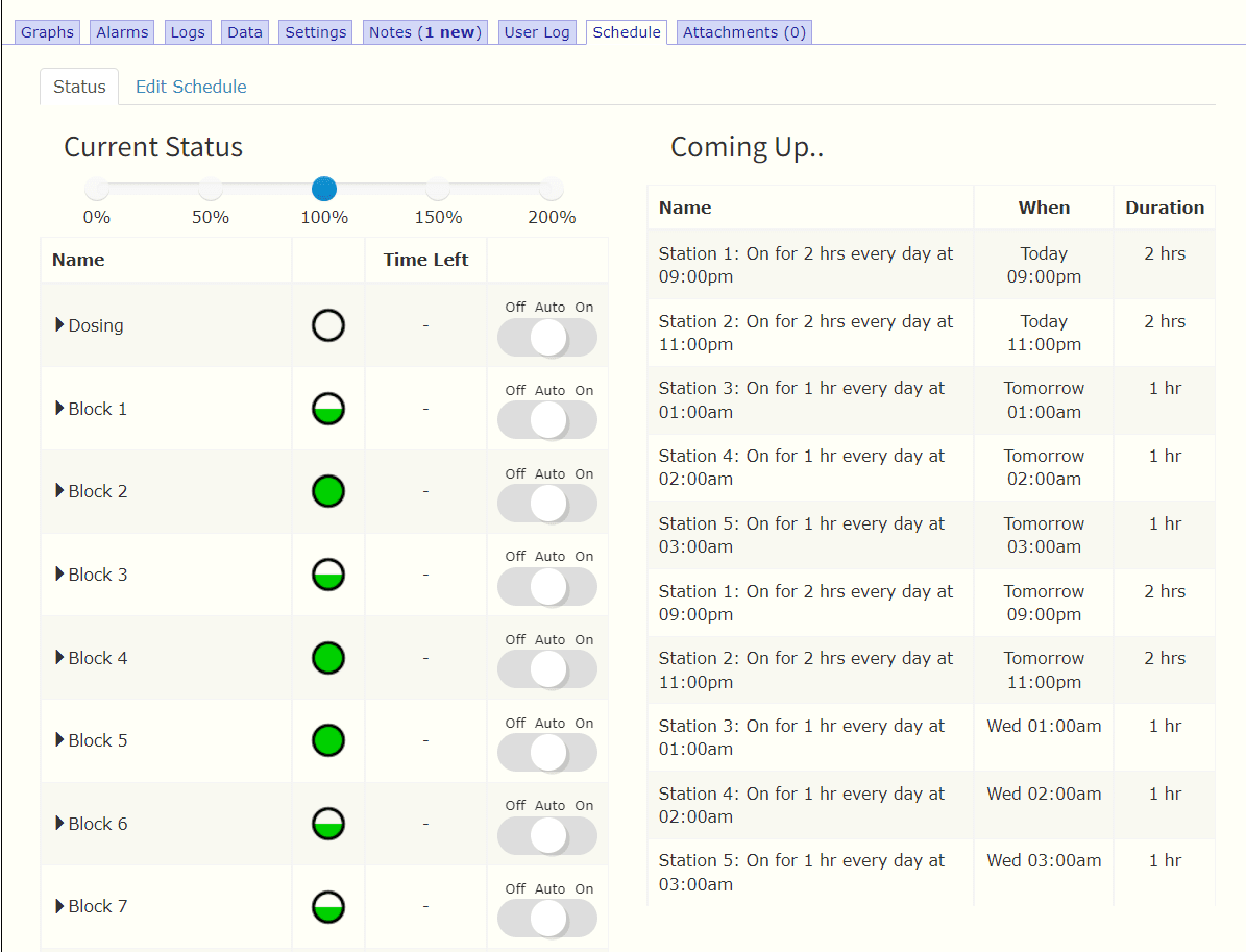 Using simple drop down menus and check boxes, complex irrigation scheduling events can be created, the system is easy to understand, and the event window allows the user to see the upcoming programmed events.